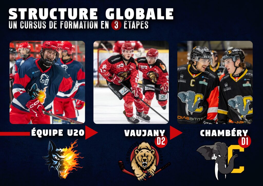 Le parcours débute en catégorie U20, où les joueurs développent leurs compétences fondamentales. Ensuite, ils rejoignent l’équipe de Vaujany en Division 2 (D2), ce qui leur permet d’acquérir de l’expérience en match et de renforcer leur esprit de compétition. Après avoir fait leurs preuves en D2, les joueurs accèdent à l’équipe de Division 1 (D1) des Éléphants de Chambéry, où ils affrontent un niveau de jeu plus exigeant.
