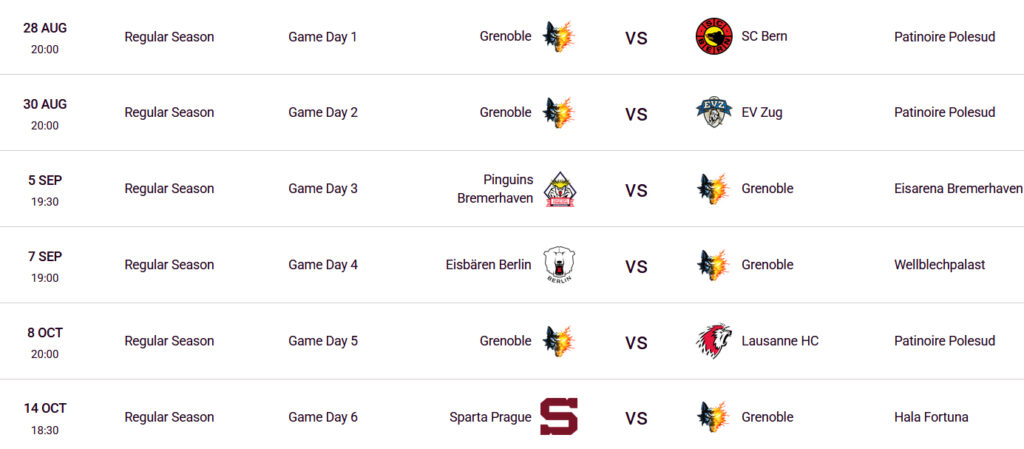 Pour leurs 3 matchs à l’extérieur, les Grenoblois se déplaceront deux fois en Allemagne, à Berlin et à Bremerhaven, ainsi qu’à Prague en Tchéquie.