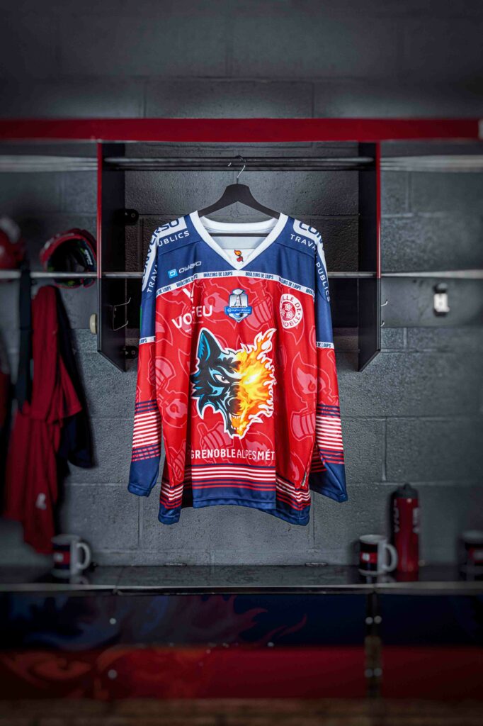 En complément de la tête de loup, elle est son symbole associé. Ses petits secrets… La flamme jaune représente une tête de loup. La spirale à l’intérieur de celle-ci représente quant à elle un G, le G de Grenoble. Portée par un gant de hockey, la torche rappelle notre histoire.