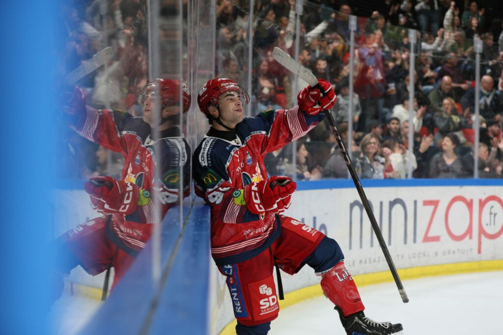 A 35 min de jeu, Matias Bachelet ramasse un palet laissé par un défenseur adverse et, du bout de sa crosse, le pousse à Nicolas Deschamps qui serre un Damien Fleury très bien placé (35′ Grenoble 4-2 Briançon) ! Encore 2 min plus tard, c’est encore Hugo Nogaretto qui frappe pour un triplé !!!
